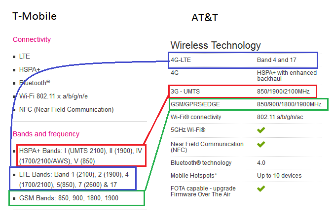 I recently purchased a Samsung Galaxy S4 from T-Mobile. I liked the fact that they have an unlocked boot loader and I am trying to cut down on my outrageous phone bill. One thing that was a requirement was that the device had to work with AT&T's 4G & LTE bands in case T-Mobile didn't have all of the coverage that AT&T did. So I did a comparison of specs between AT&T and T-Mobile as shown below.